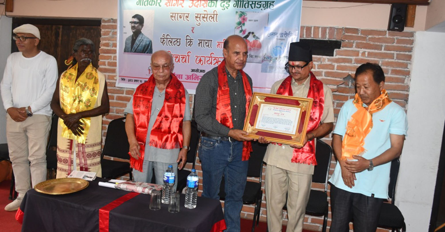 भक्तपुर । गीतकार सागर उदासका दुई कृति ‘सागर सुसेली’ र ‘फैलिन्छ कि माया’ माथि परिचर्चा गरिएको छ । सिर्जना अभियान समाजको आयोजनामा भएको परिचर्चा कार्यक्रममा गीतकार सुवासचन्द्र ढुंगेलले सागरका गीतहरूमा दुःख, पीडा, वियोग रहेको बताउनुभयो ।