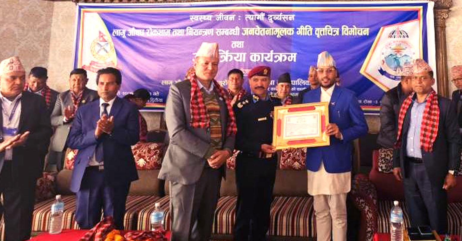 काठमाडौं । लोकप्रिय गायक एवं गीतकार तथा संगीतकार रामप्रसाद अवस्थीको जनचेतनामूलक गीति वृत्तचित्र ‘लागूूऔषध छाडौं’ सार्वजनिक भएको छ । लागूूऔषध दुुव्र्यसन रोकथाम तथा नियन्त्रण व्युुरोसँगको सहकार्यमा निर्माण गरिएको सो वृत्तचित्रलाई नेपाल प्रहरीका प्रमुख प्रहरी महानिरीक्षक वसन्तबहादुुर कुँवरले एक कार्यक्रमबीच विमोजन गर्नु भएको हो ।
