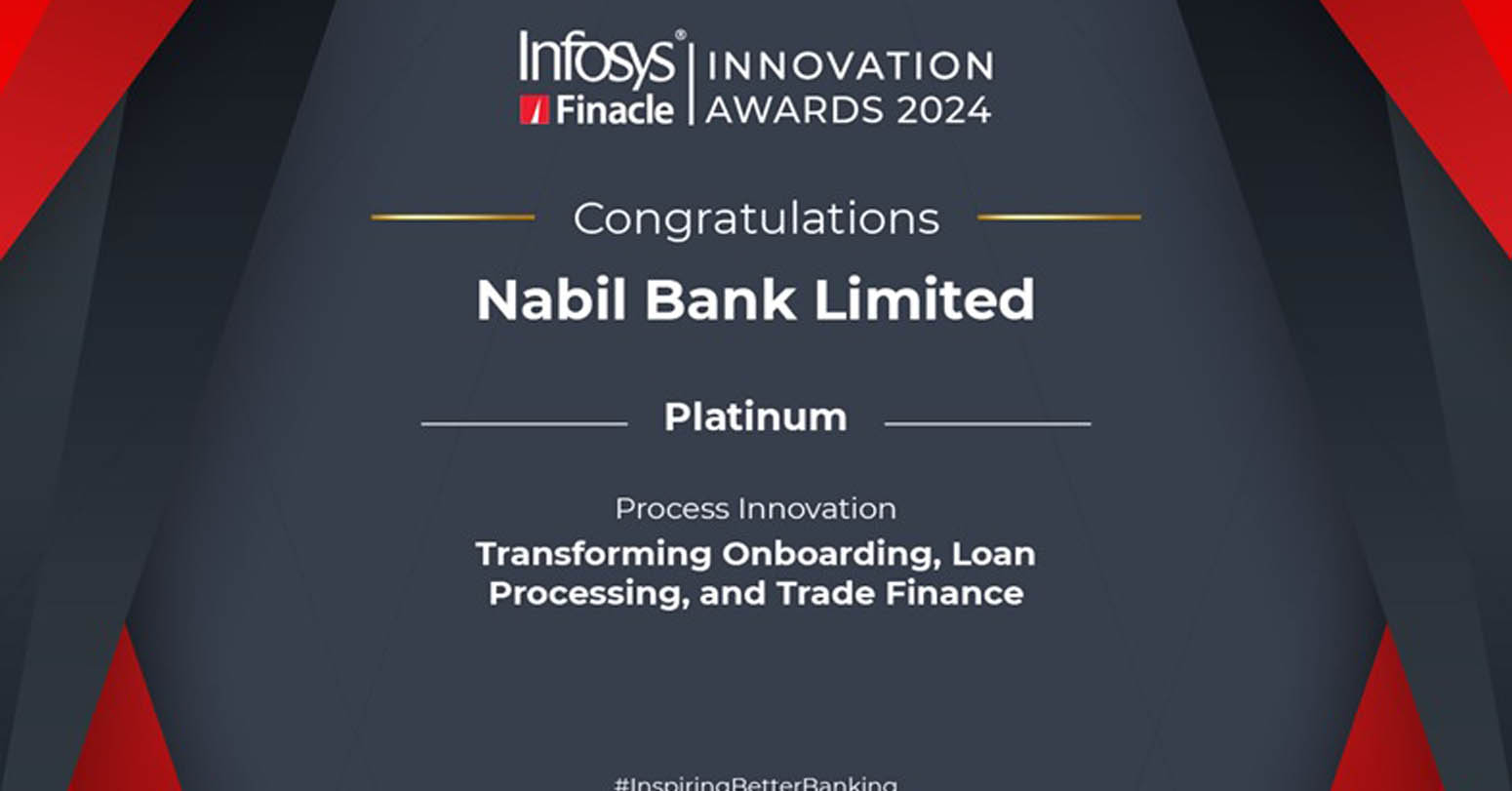 काठमाडौं । नबिल बैंकले प्लेटिनम इन्फोसिस फिनाकल इनोभेसन अवार्ड जितेको छ । इन्फोसिस फिनाकल इनोभेसन अवार्ड २०२४ मा प्रोसेस इनोभेसनका लागि नबिलले प्लेटिनम अवार्ड पाएको हो ।