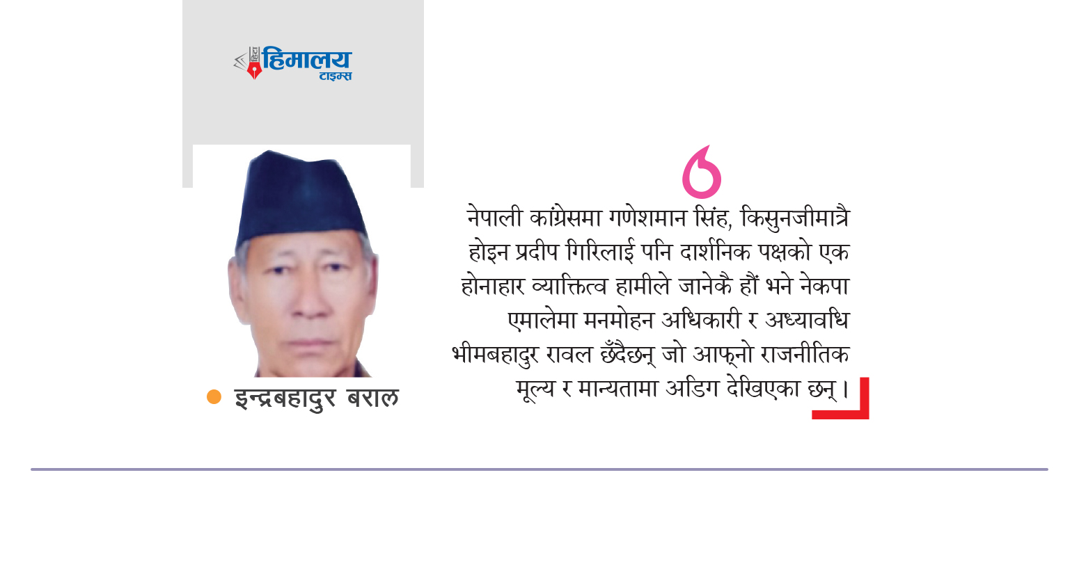 संसारमा बिरलै व्यक्तित्व हुँदा रहेछन् जसले आफ्ना राजनीतिक मूल्य र मान्यताको उच्चतम महत्व दिँदा रहेछन् । हाम्रोजस्तो देशमा औंलामा गन्न सकिने मानिसहरूले मात्र आफ्नो मूल्य मान्यताका सामु सत्ता र शक्तिलाई ठूलो कुरा देखेनन् । प्रधानमन्त्री पदको अफर छोडेर अरूतिर फर्काए तर पनि त्यो त्यागको सम्मान गर्नुको सट्टा अवमूल्यन गर्ने काम भयो । नेपाली कांग्रेसमा गणेशमान सिंह, किसुनजीमात्रै होइन प्रदीप गिरिलाई पनि दार्शनिक पक्षको एक होनाहार व्याक्तित्व हामीले जानेकै हौं भने नेकपा एमालेमा मनमोहन अधिकारी र अध्यावधि भीमबहादुर रावल छँदैछन् जो आफ्नो राजनीतिक मूल्य र मान्यतामा अडिग देखिएका छन् । त्यो नै दार्शनिक पक्षको दृढता हो ।