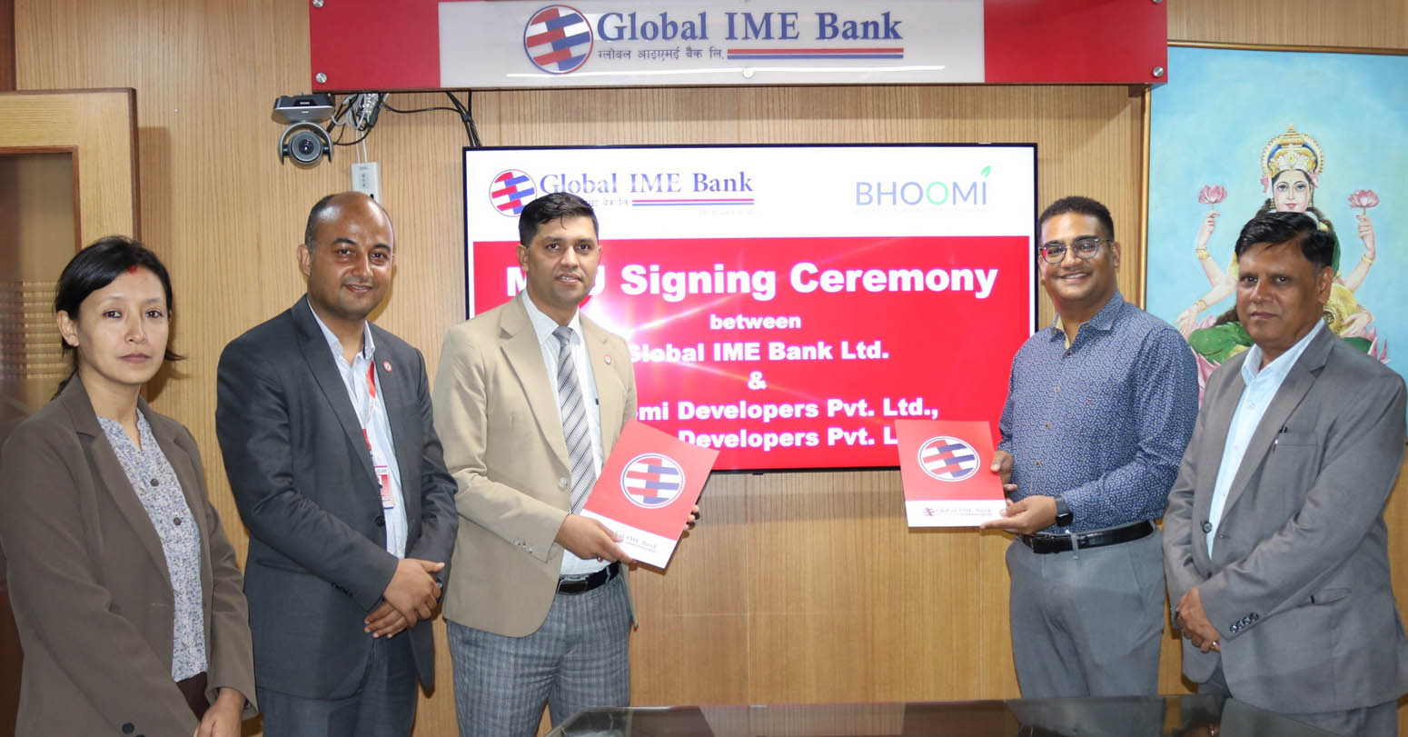 काठमाडौं । ग्लोबल आइएमई बैंक र भूमि डेभलपर्स प्रालि तथा प्यासिफिक डेभलपर्स प्रालिबीच हरित आवास कर्जा प्रवाहसम्बन्धी सम्झौता भएको छ । सम्झौताअनुसार बैंकले ललितपुर जिल्ला, गोदावरी नगरपालिका ३, किटिनीस्थित भूमि डेभलपर्स तथा प्यासिफिक डेभलपर्सले निर्माण गर्ने वातावरणमैत्री आवासीय घर खरिदकर्तालाई सहज रूपमा कर्जा प्रवाह गर्नेछ । बैंकले भूमि तथा प्यासिफिक डेभलपर्सले बिक्री गर्ने वातावरणमैत्री आवासीय घर खरिद गर्न चाहने ग्राहकलाई तीन कार्यदिनभित्र सरल र सहज कर्जा प्रवाह गर्नेछ ।
