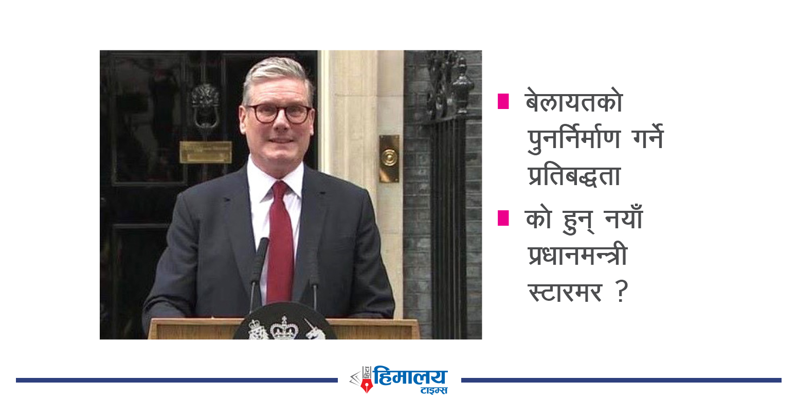 बेलायतका नवनियुक्त प्रधानमन्त्री लेबर पार्टीका सर किअर स्टार्मरले देशको पुनर्निर्माणका लागि तत्कालै काम सुरु गर्ने प्रतिबद्धता जनाउनुभएको छ । उहाँले देशको भाग्य पुनःस्थापित गर्नका लागि तत्काल काम कारबाही थाल्ने वाचा गर्नुभएको छ । बेलायतमा घट्दो सार्वजनिक सेवा, उच्च मूल्य र दलहरूका वाचा पूरा नहुँदा निराशा बढ्दै गएको अवस्थामा स्टार्मर नयाँ प्रधानमन्त्रीमा नियुक्त हुनुभएको र नागरिकका अपेक्षा पूरा गर्नुपर्ने जिम्मेवारी रहेको विश्लेषक बताउँछन् ।