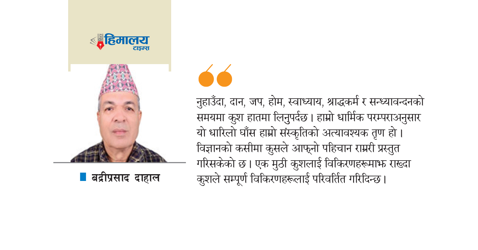 नुहाउँदा, दान, जप, होम, स्वाध्याय, श्राद्धकर्म र सन्ध्यावन्दनको समयमा कुश हातमा लिनुुपर्दछ । हाम्रो धार्मिक परम्पराअनुसार यो धारिलो घाँस हाम्रो संस्कृतिको अत्यावश्यक तृण हो । विज्ञानको कसीमा कुसले आफ्नो पहिचान राम्ररी प्रस्तुत गरिसकेको छ । एक मुठी कुशलाई विकिरणहरूमाझ राख्दा कुशले सम्पूर्ण विकिरणहरूलाई परिवर्तित गरिदियो । वातावरणमा भएका नकारात्मक तरंग र विकिरणलाई निस्तेज पारेको कुरालाई विज्ञानले सिद्ध गरेको छ । त्यसैले त हाम्रा ऋषर्च म्यान अर्थात् ऋषिमुनिहरुले धेरै अघिदेखि हातका औँलामा कुशको औँठी, हातमा बाला, ब्रहृमरन्ध्रमा कुशको टुुक्रा र आसनमा कुशको चगटी पञ्चगव्यमा कुश देव तथा पितृकार्य र हवनमा अत्यावश्यक भएको औँल्याउनुको रहस्य रहेछ ।