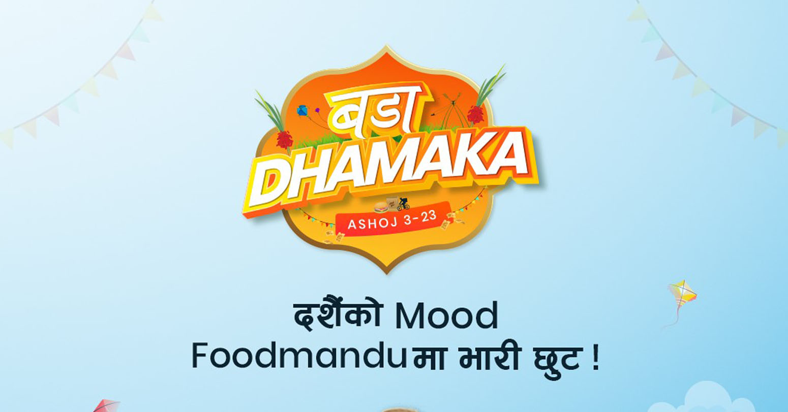 काठमाडौं । फुड डेलिभरी कम्पनी फुडमाण्डुले नेपालीहरूको महान् चाड विजयादशमीका अवसरमा ‘बडा धमाका’ नामक क्याम्पेन ल्याएको छ । हरेक महिनाको पहिलो हप्ता चल्ने फुडमाण्डु डबल धमाका क्याम्पेन बडा दशैँमा झनै ठूलो हुने कम्पनीले जनाएको छ । बडा धमाकाअन्तर्गत ग्राहकले काठमाडौं, पोखरा र चितवनका ६० भन्दा बढी रेस्टुरेन्टका सबै आइटममा ५० प्रतिशतसम्म छुट पाउन सक्नेछन् ।