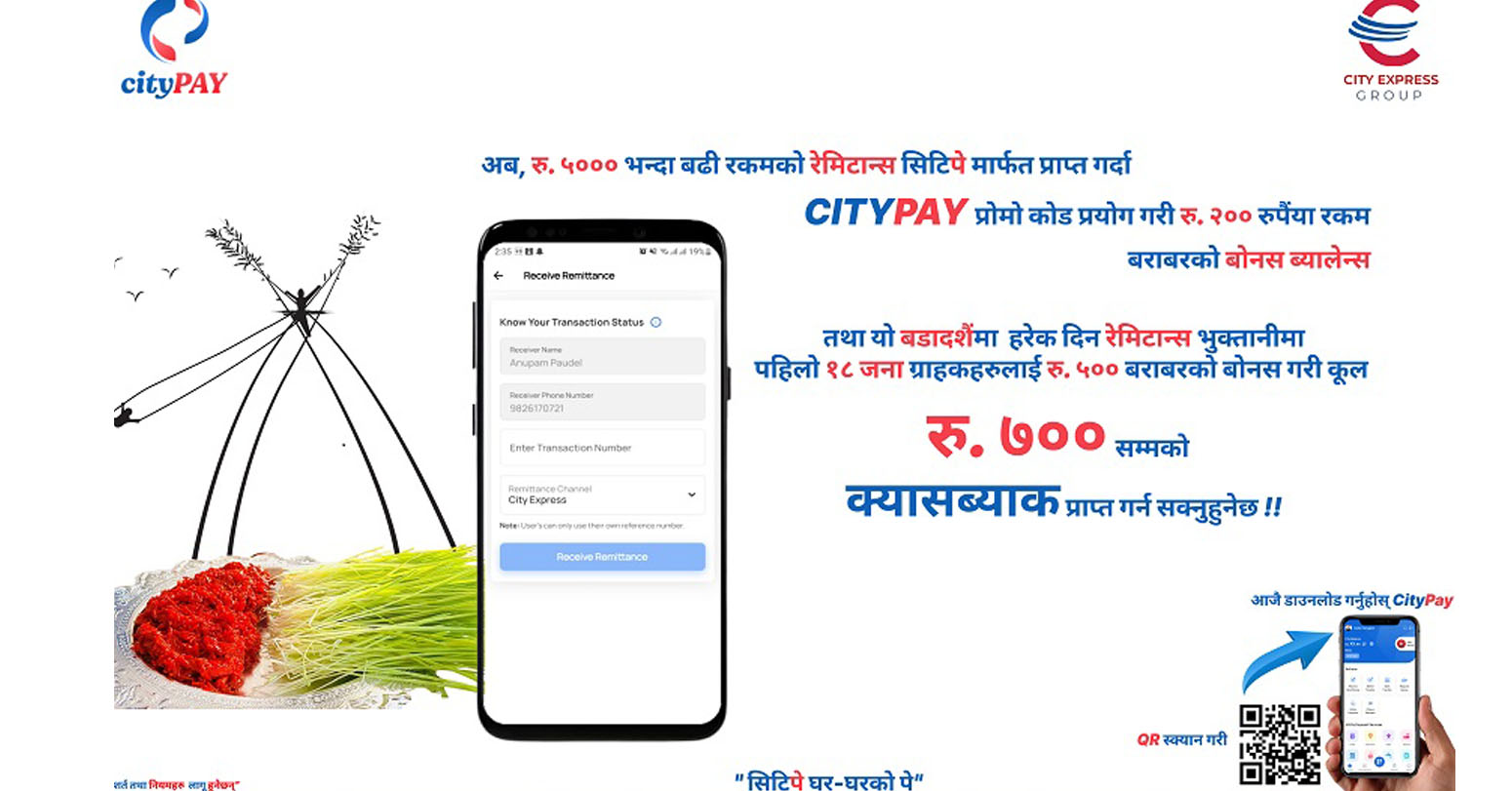 काठमाडौं । सिटी वालेट प्रालिले दशैँ, तिहार र छठपर्वका अवसरमा विशेष क्यासब्याक घोषणा गरेको छ । ग्राहकले आफैं रेमिट भुक्तानी गर्ने प्रक्रियालाई प्रोत्साहन गर्न क्यासब्याक घोषणा गरिएको कम्पनीले जनाएको छ । पाँच हजारभन्दा बढी रकमको रेमिट्यान्स सिटी पे वालेटमार्फत् प्राप्त गर्दा सिटी पे प्रोमो कोड प्रयोग गरी दुई सय रुपैयाँ रकम बराबरको बोनस ब्यालेन्स तथा हरेक दिन रेमिट्यान्स भुक्तानीमा पहिलो १८ जना ग्राहकले पाँच सय रुपैयाँ बराबरको बोनस गरी कुल सात सय रुपैयाँसम्मको क्यासब्याक प्राप्त गर्न सक्नेछन् ।