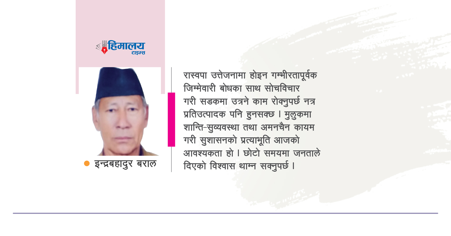 रास्वपा उत्तेजनामा होइन गम्भीरतापूर्वक जिम्मेवारी बोधका साथ सोचविचार गरी सडकमा उत्रने काम रोक्नुपर्छ नत्र प्रतिउत्पादक पनि हुनसक्छ । मुलुकमा शान्ति-सुव्यवस्था तथा अमनचैन कायम गरी सुशासनको प्रत्याभूति आजको आवश्यकता हो । छोटो समयमा जनताले दिएको विश्वास थाम्न सक्नुपर्छ ।