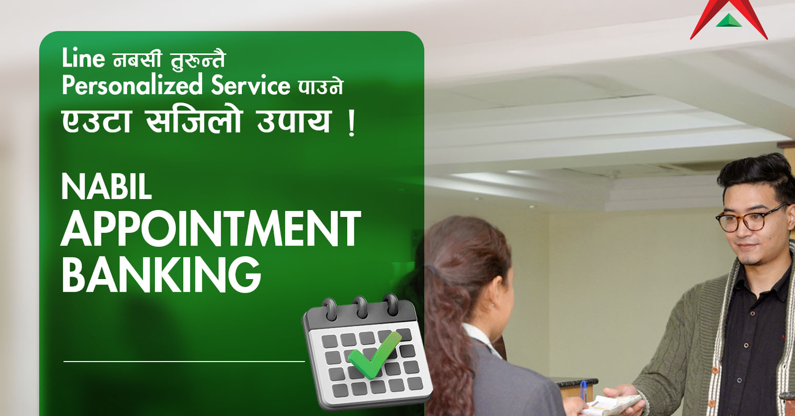 काठमाडौं । नबिल बैंकले अपोइन्टमेन्ट बैंकिङ प्रणालीको सुरुवात गरेको छ । ग्राहकको सुविधालाई ध्यानमा राखेर व्यस्त समयको व्यवस्थापन गरी छरितो सुविधा दिन यस्तो प्रणाली सुरु गरिएकोे नबिल बैंकले जनाएको छ । तत्कालका लागि नबिल बैंकको केन्द्रीय कार्यालय तीनधाराबाट यसप्रकारको सेवा दिन थालिएको छ ।